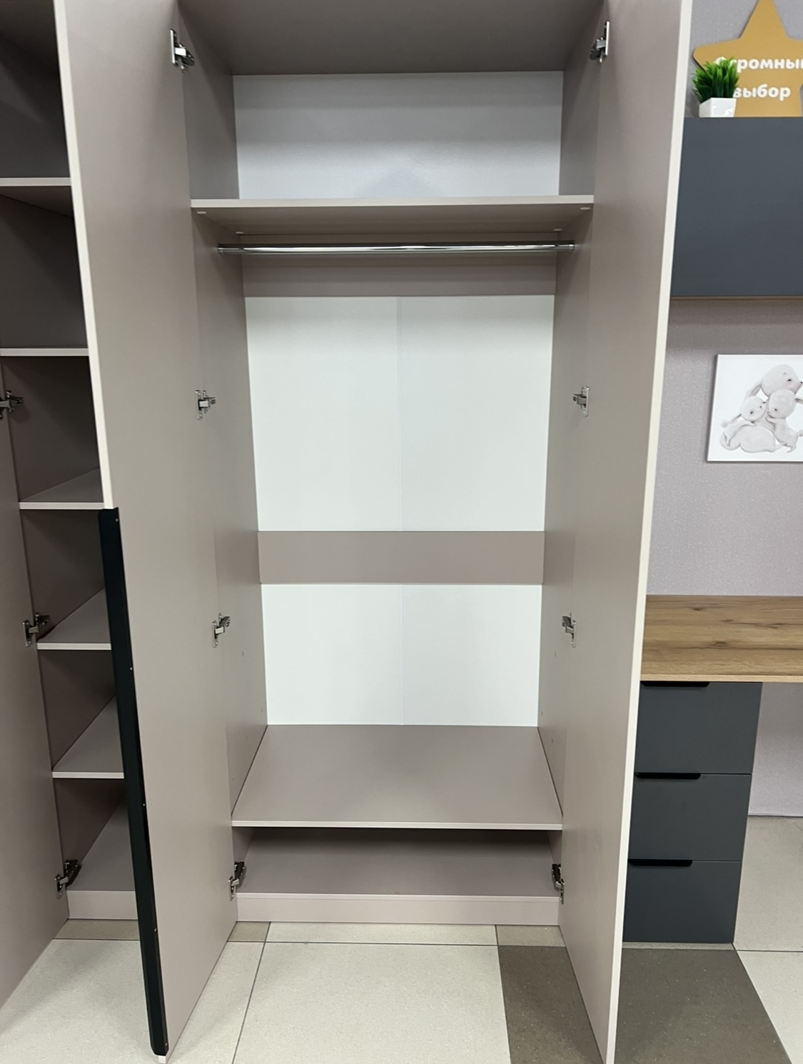 Внутри шкафа расположены большая штанга, верхняя и нижняя полки.