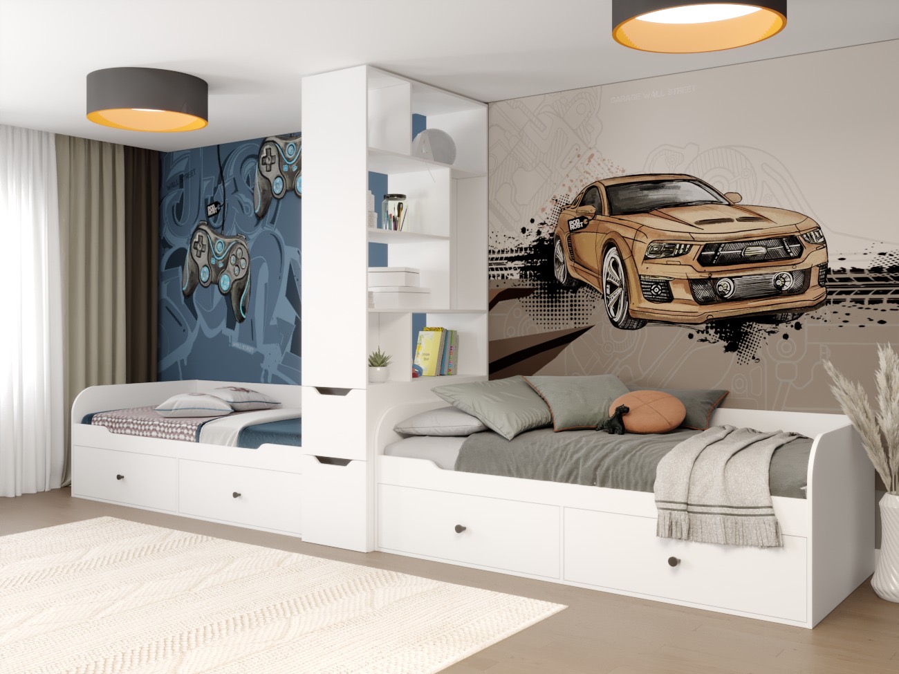 С помощью стеллажа можно разделить комнату на отдельные зоны: отдыха, учебы, встречи с друзьями, можно зонировать комнату для двоих детей.