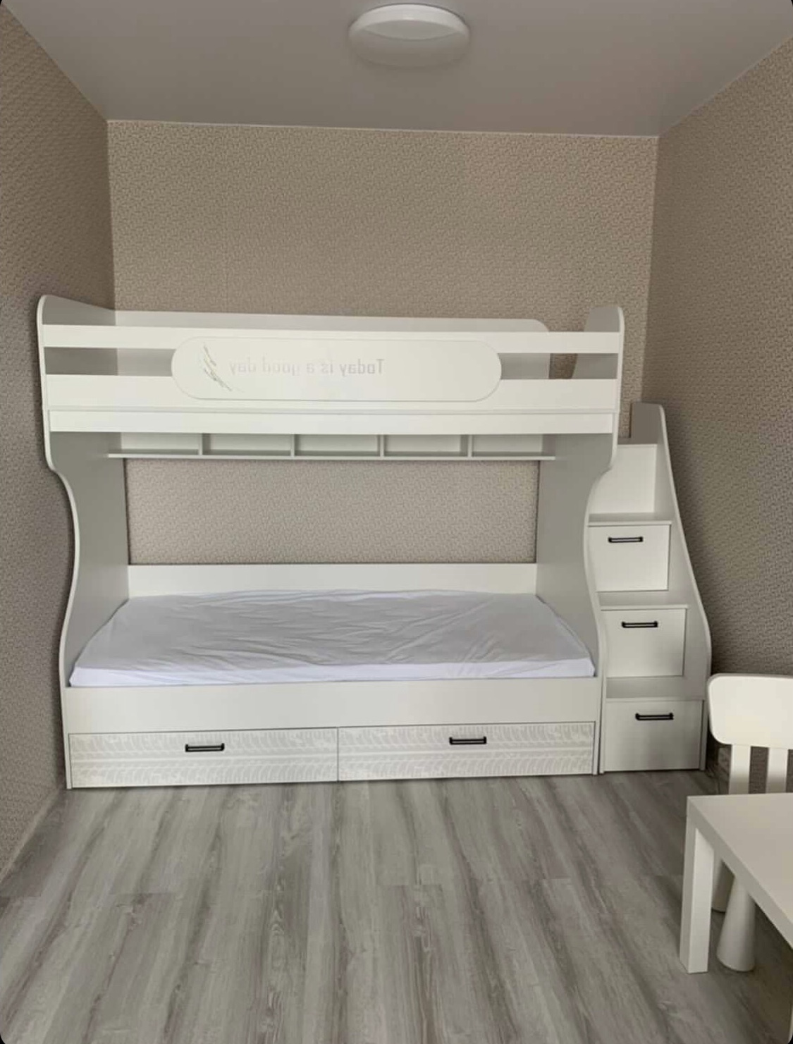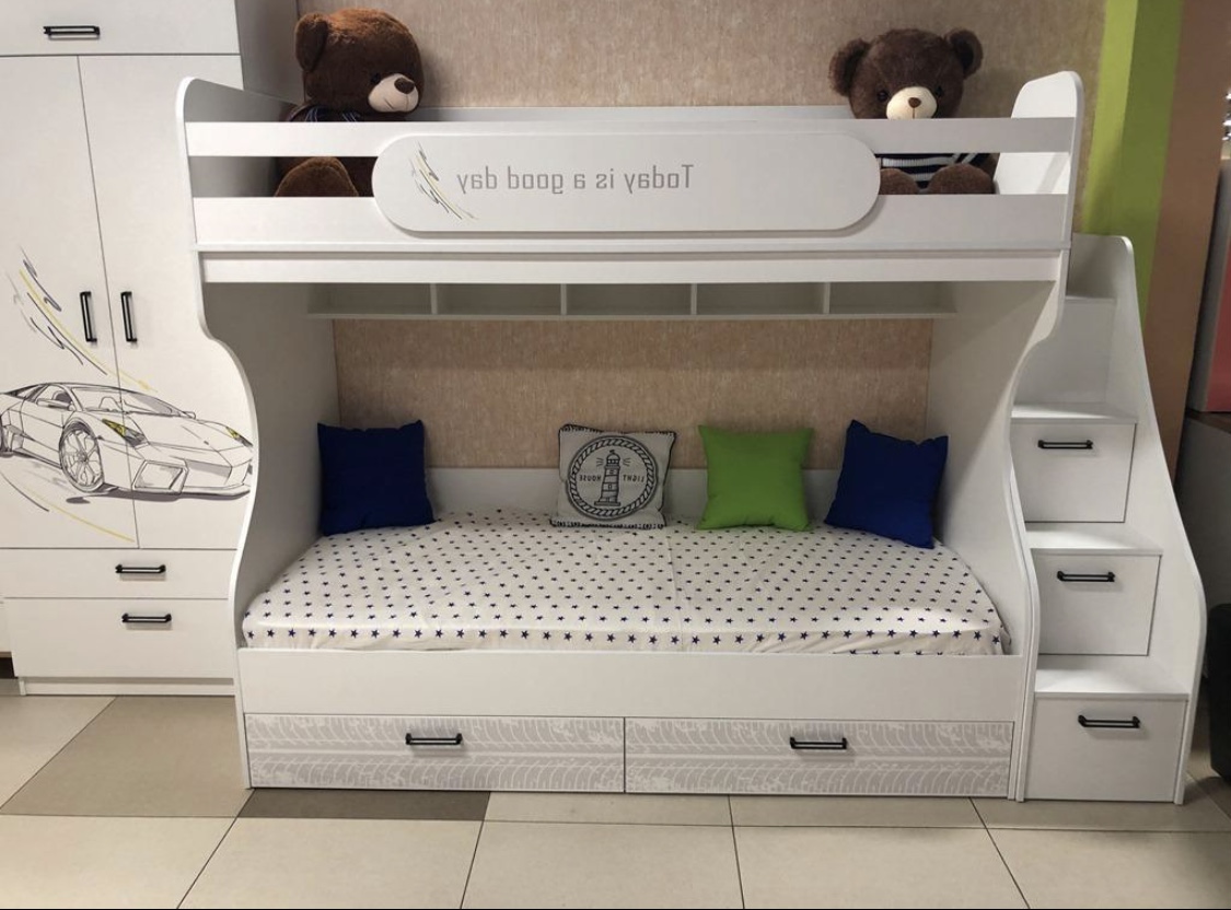 Основание кровати – прочный настил ЛДСП, который позволяет ребенку спать на ровной поверхности, что важно для детской спины. Прочное основание не скрипит и не сломается при играх. Отлично подходит как для пружинных, так и беспружинных матрасов.