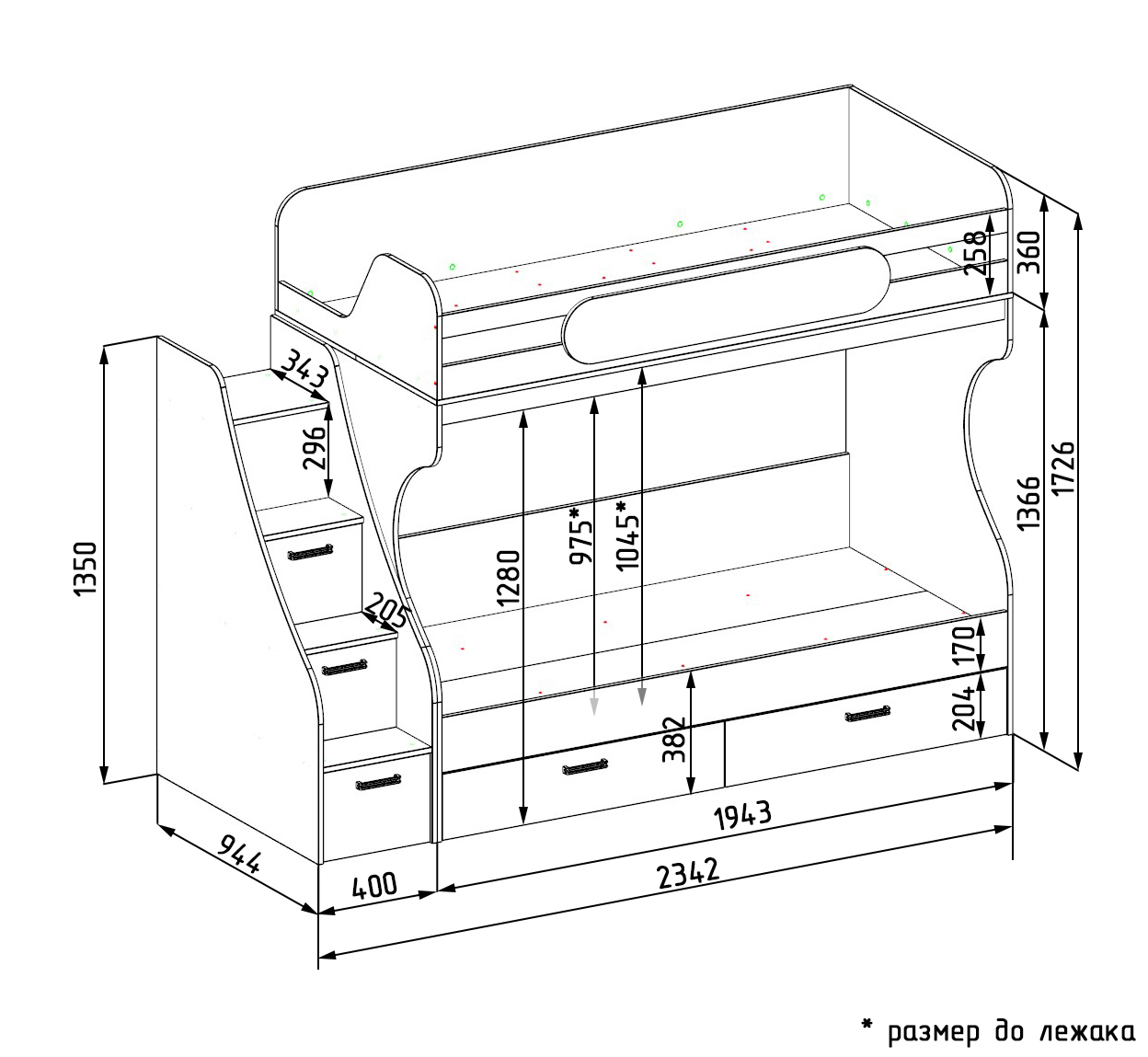 Габариты кровати: ширина вместе с лестницей 2343, глубина 958, высота 1726 мм
