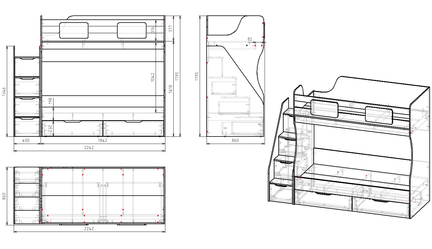 Кровать имеет также два выдвижных ящика для хранения белья или игрушек с доводчиками.