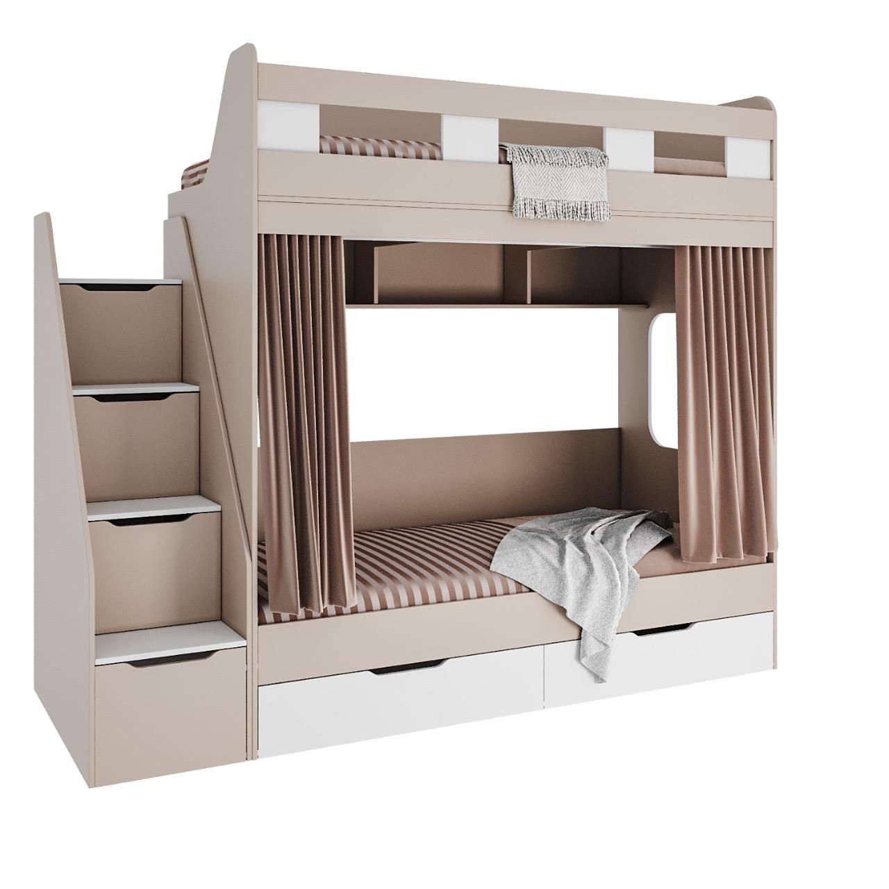 спальное место для двоих, навесная полка для книг и игрушек, вместительные выдвижные ящики под кроватью, а также безопасная лестница расположенная сбоку, обеспечивающая быстрый и удобный доступ на второй этаж, с безопасными ступенями в виде выдвижных ящиков.