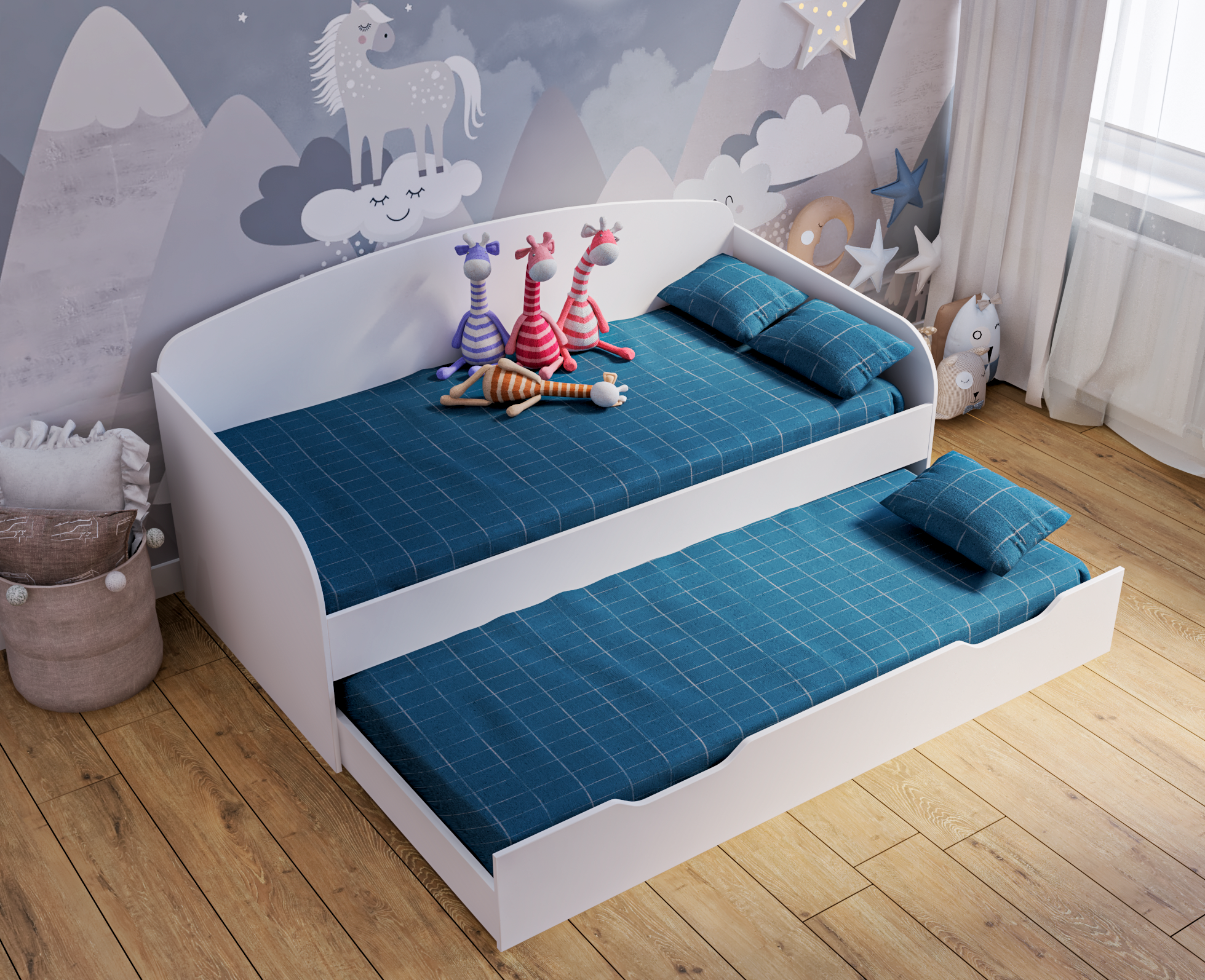 Нижняя кровать на выкатных роликах (при желании кровать можно выдвинуть полностью и поставить в другое место).