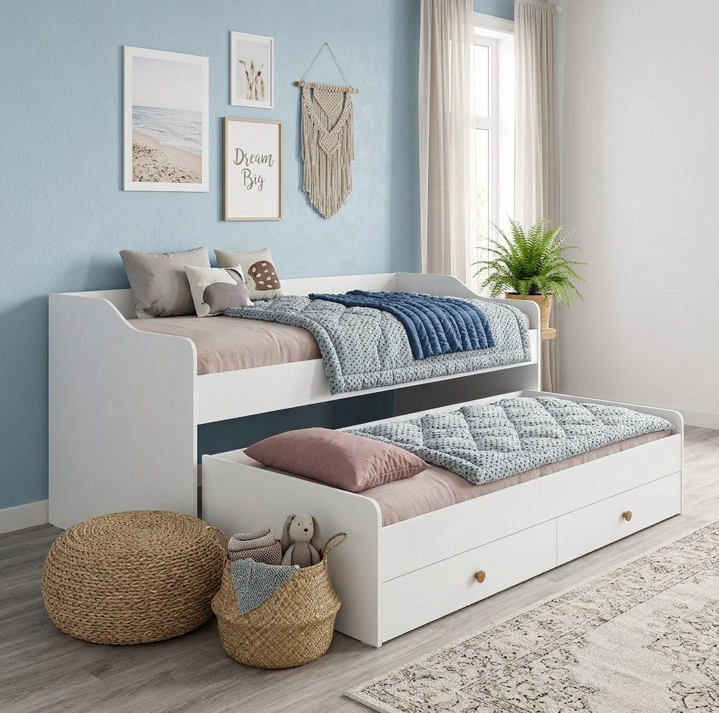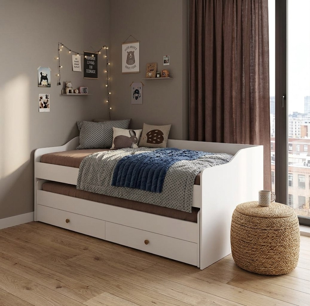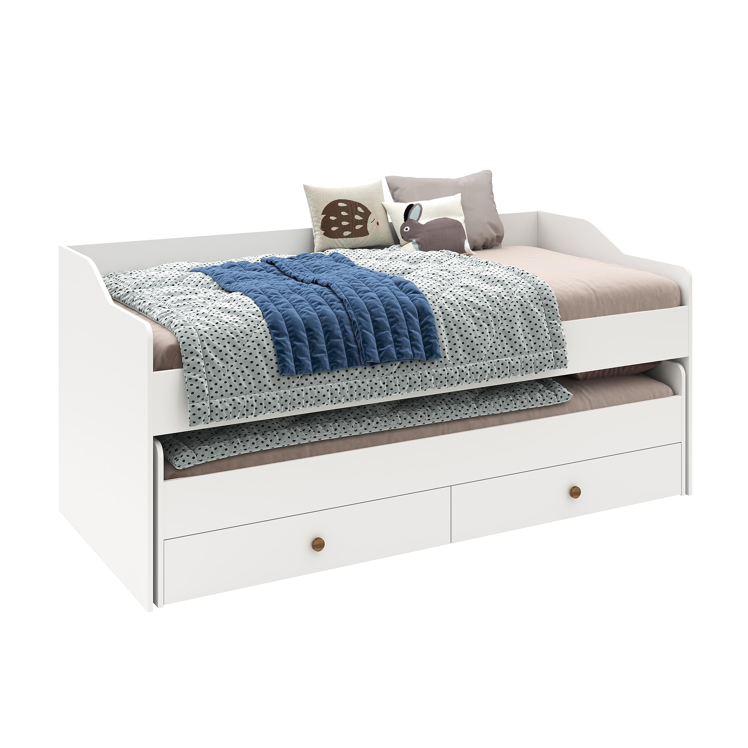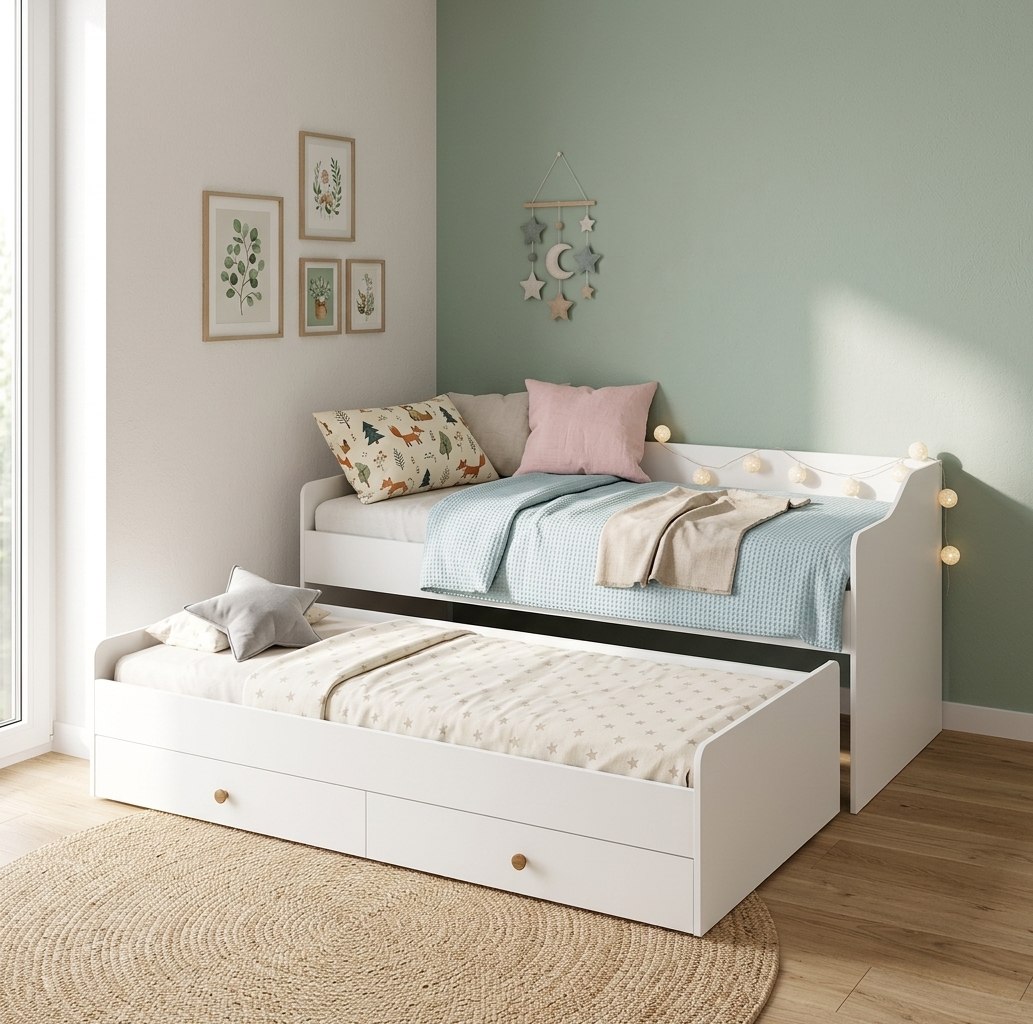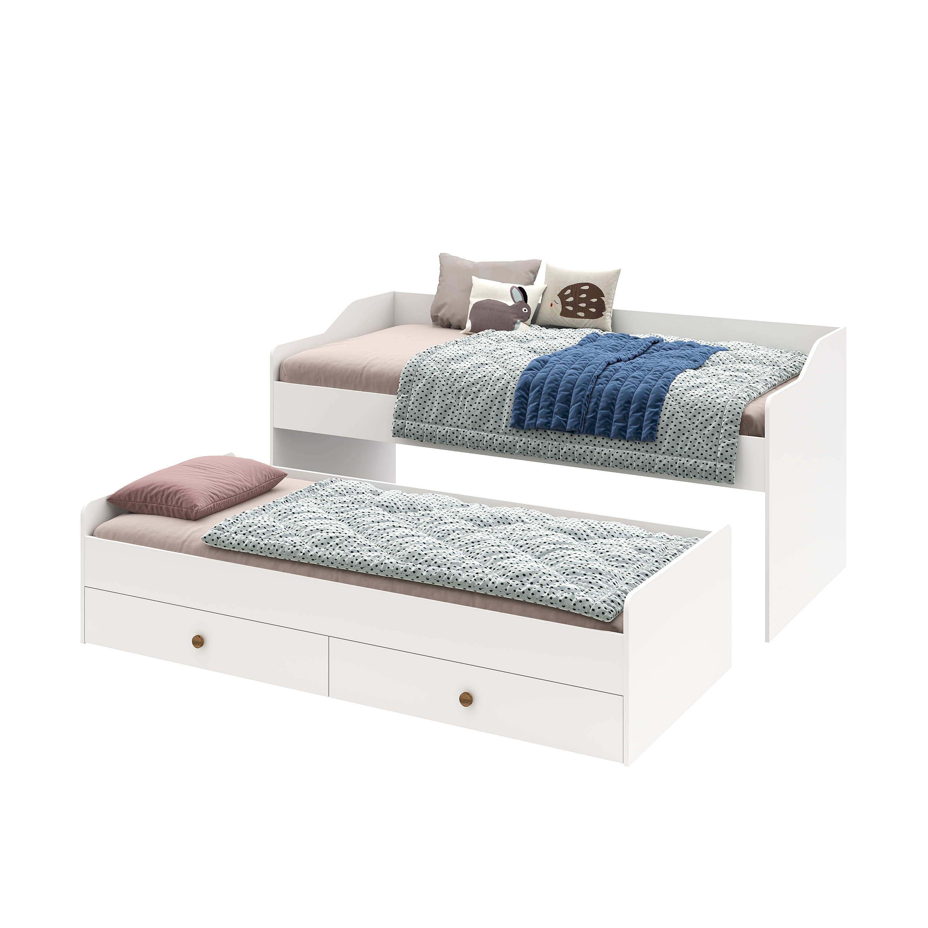 Выдвижное спальное место позволяет гибко использовать пространство, а два встроенных ящика в нижней кровати на шариковых направляющих обеспечат место для хранения.