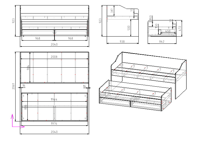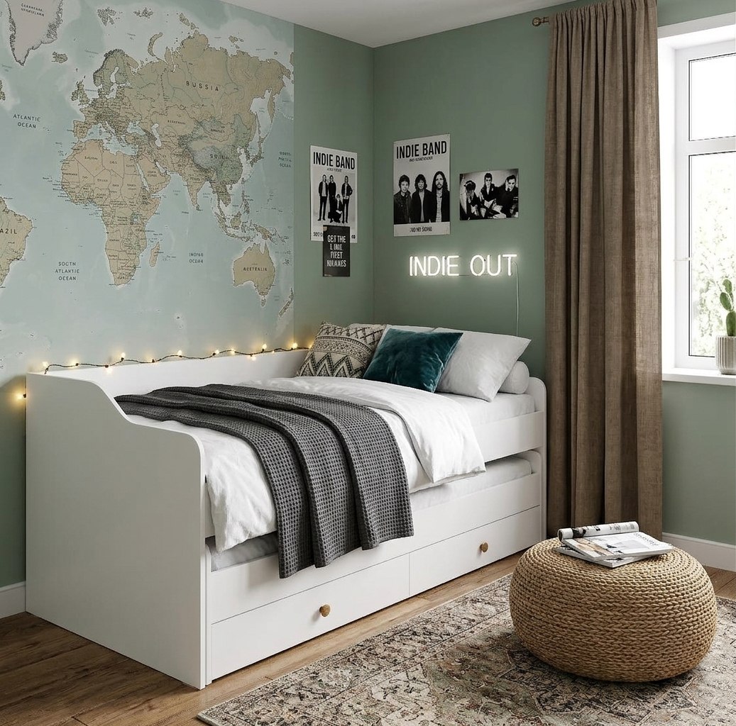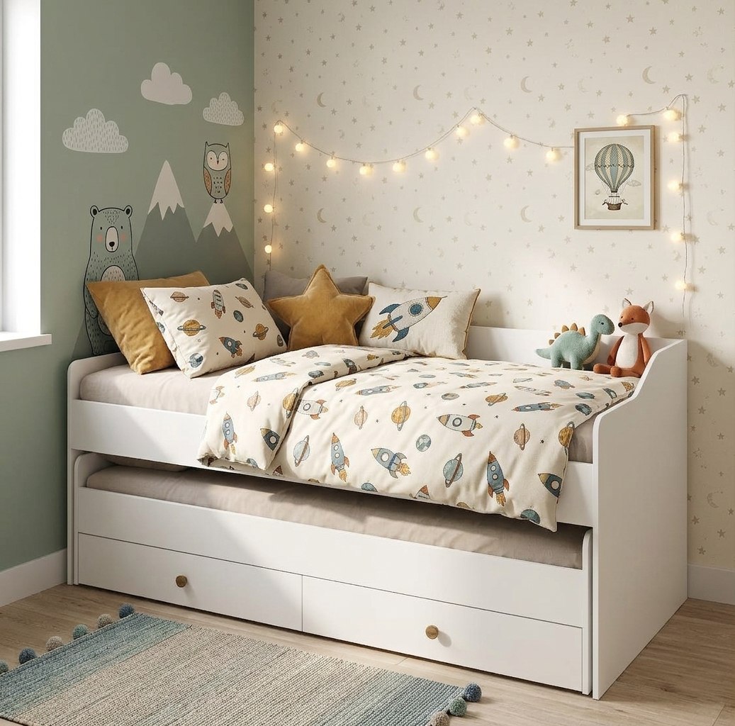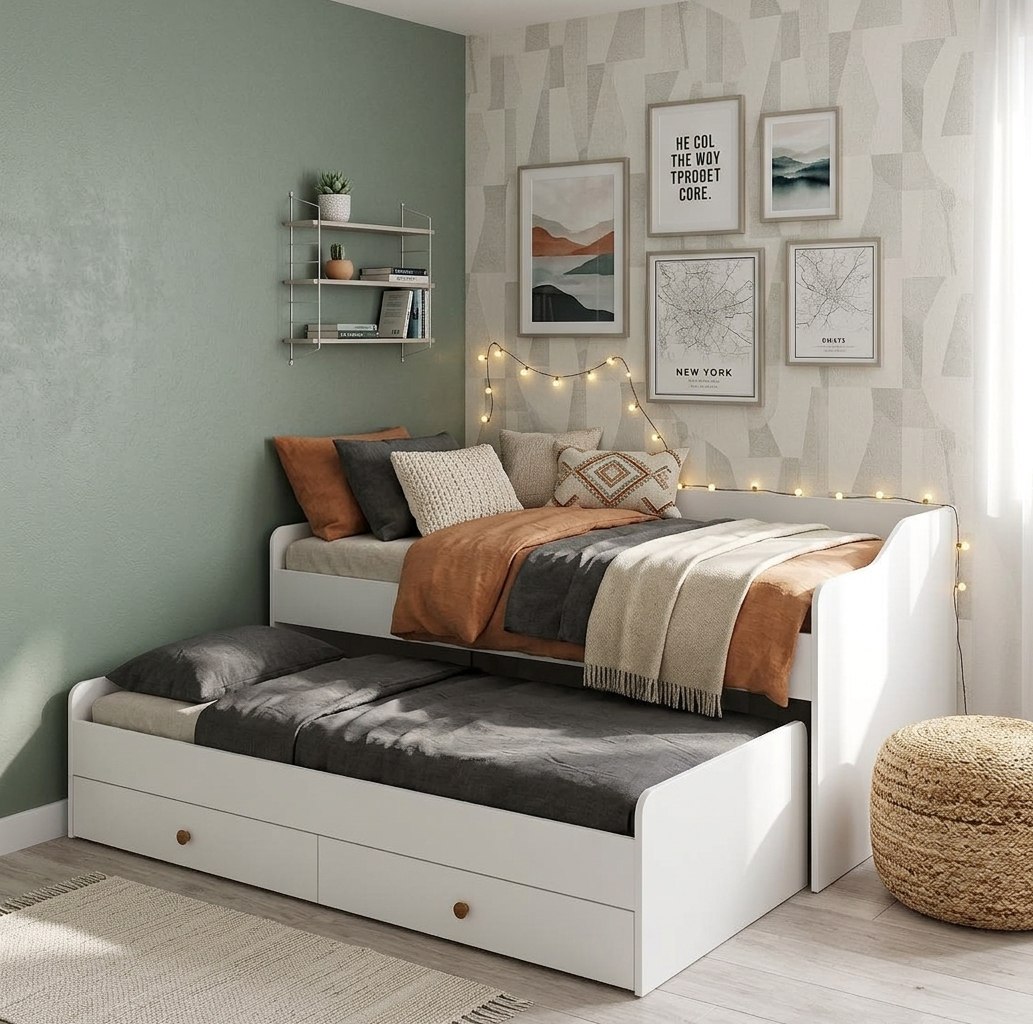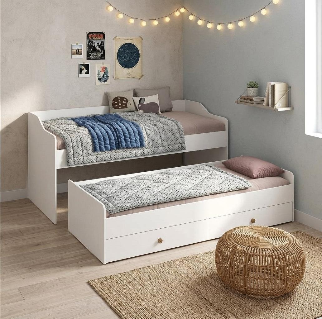Выдвижное спальное место позволяет гибко использовать пространство, а два встроенных ящика в нижней кровати на шариковых направляющих обеспечат место для хранения.