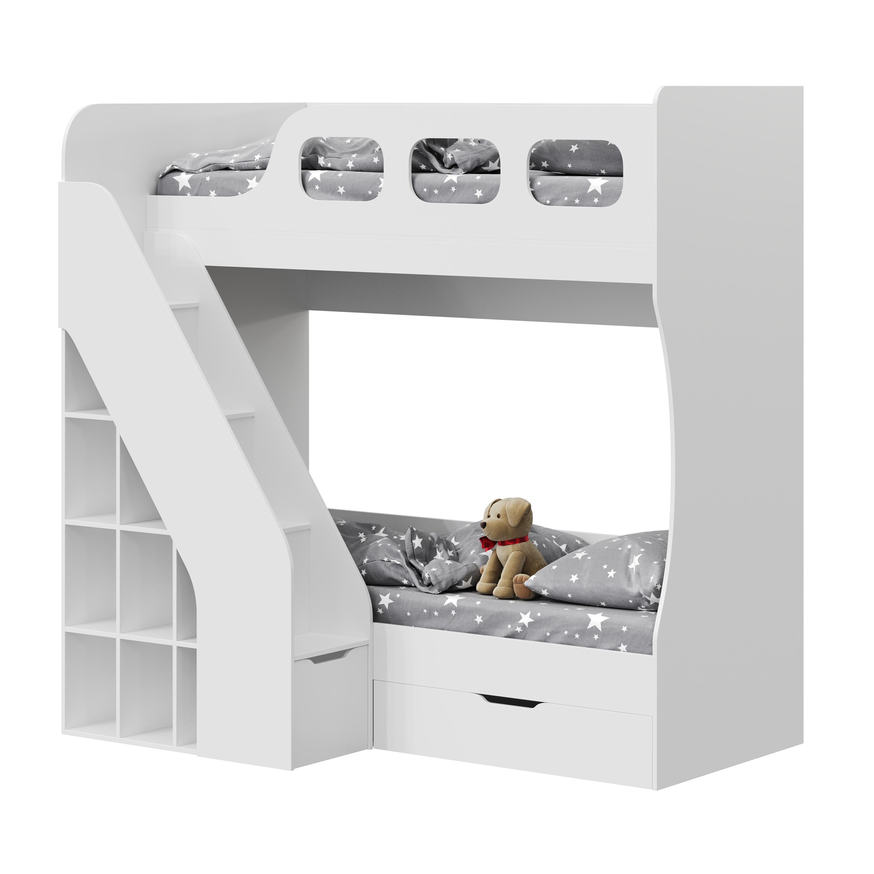 В нижнюю кровать встроен выдвижной ящик для белья и игрушек.