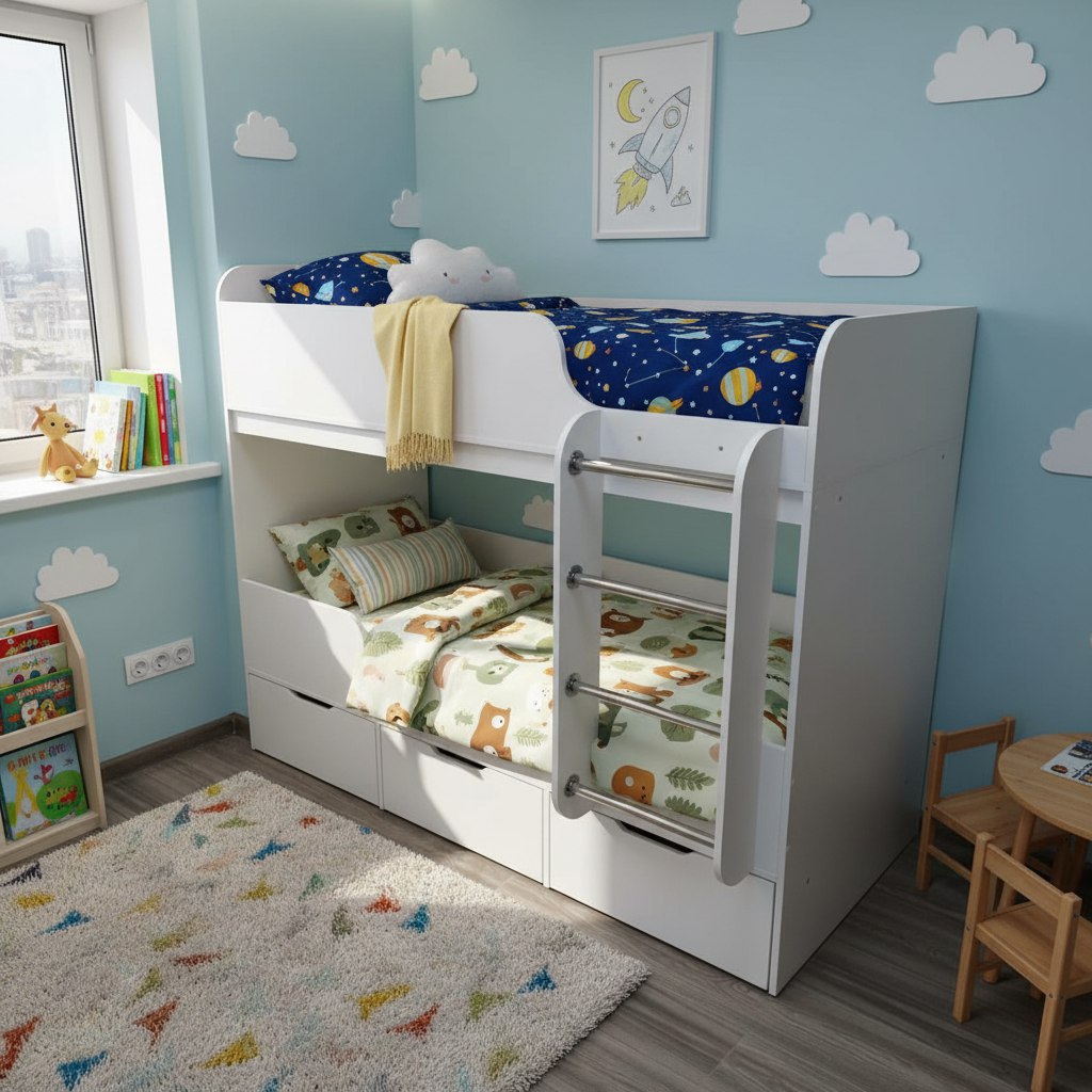 Компактная двухъярусная кровать Малыш Двойняшка создана специально для небольших помещений.