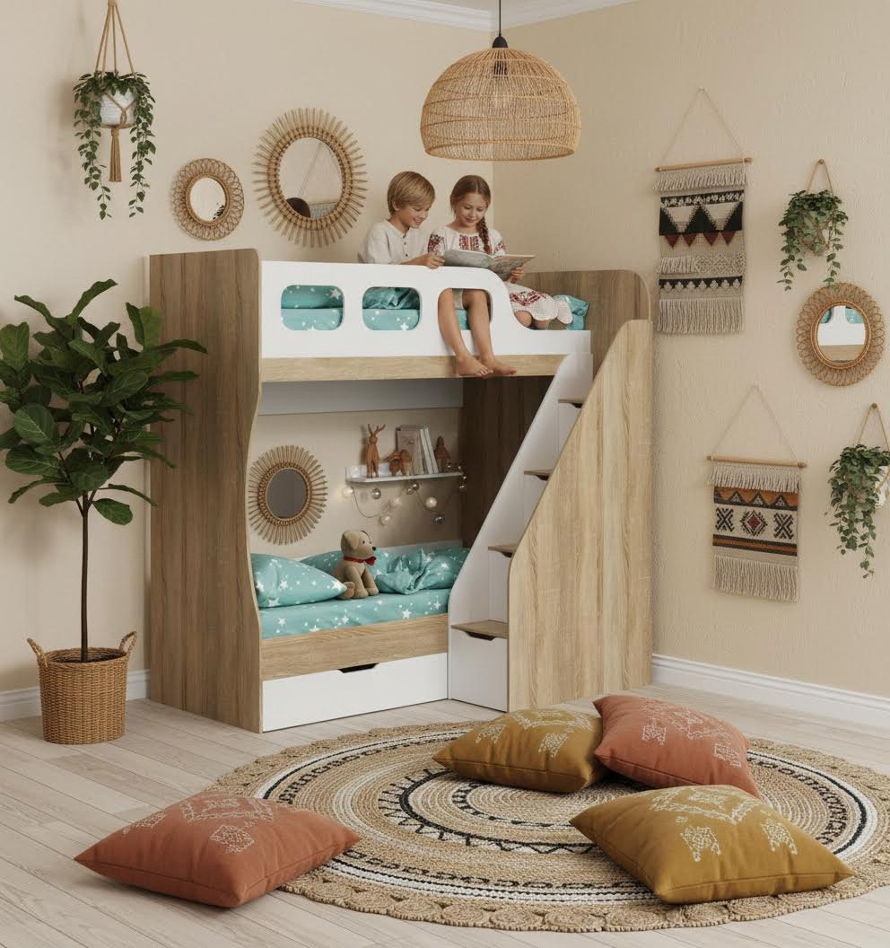 * В нижнюю кровать встроен выдвижной ящик для белья и игрушек.