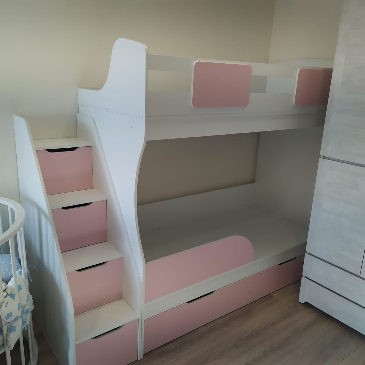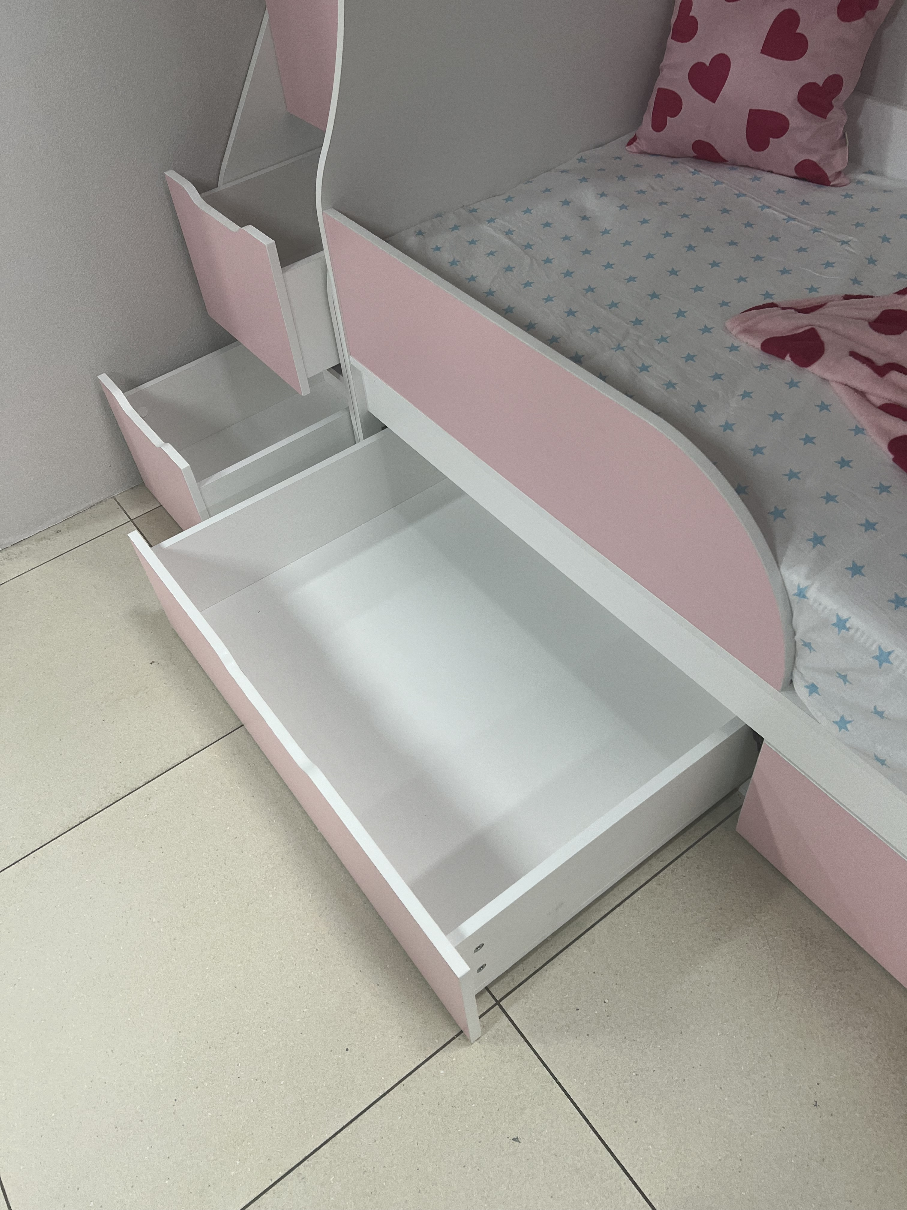 Кровать имеет также два выдвижных ящика для хранения белья или игрушек (ящики на выкатных роликах).