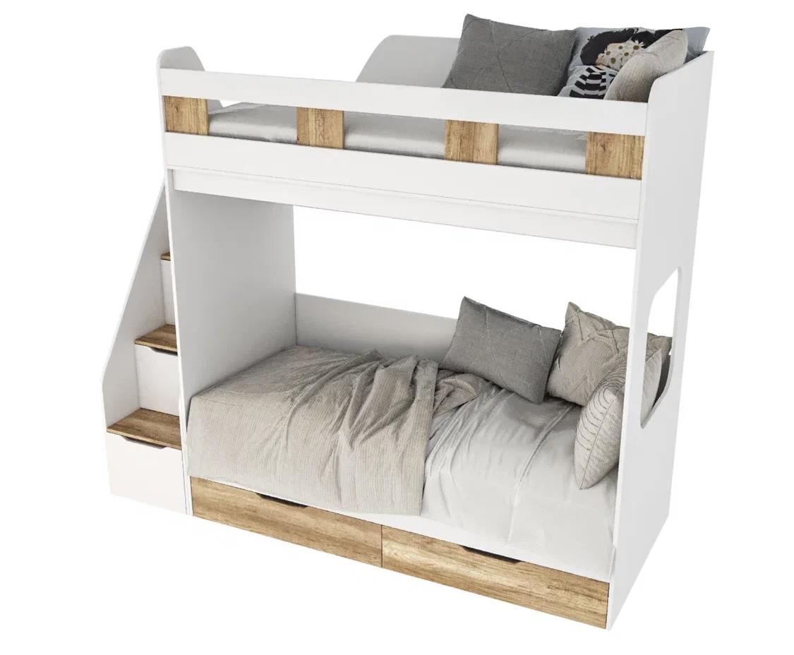 Прочная, стильная двухъярусная кровать Твинс с удобной лестницей, безопасным высоким бортиком и ящиками для хранения.