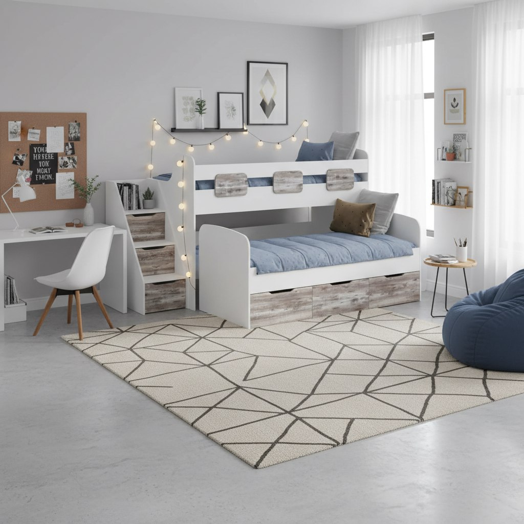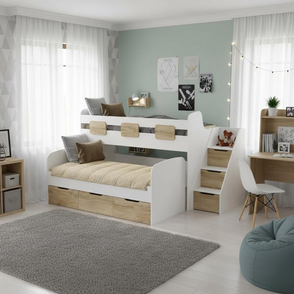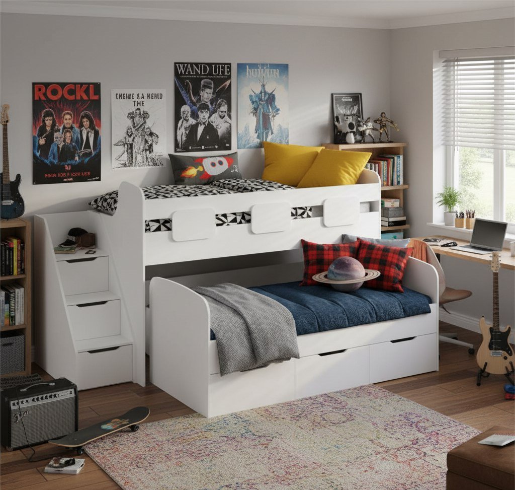- Невысокая конструкция кровати обеспечивает удобный доступ на второй этаж, делая её идеальной даже для самых маленьких детей.