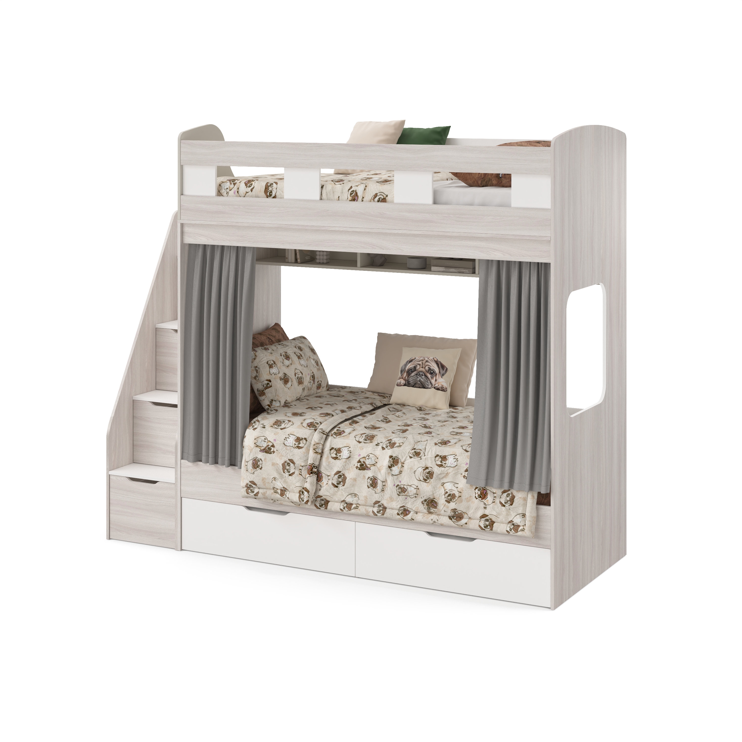 Прочная, стильная двухъярусная кровать Твинс с удобной лестницей, безопасным высоким бортиком и ящиками для хранения.