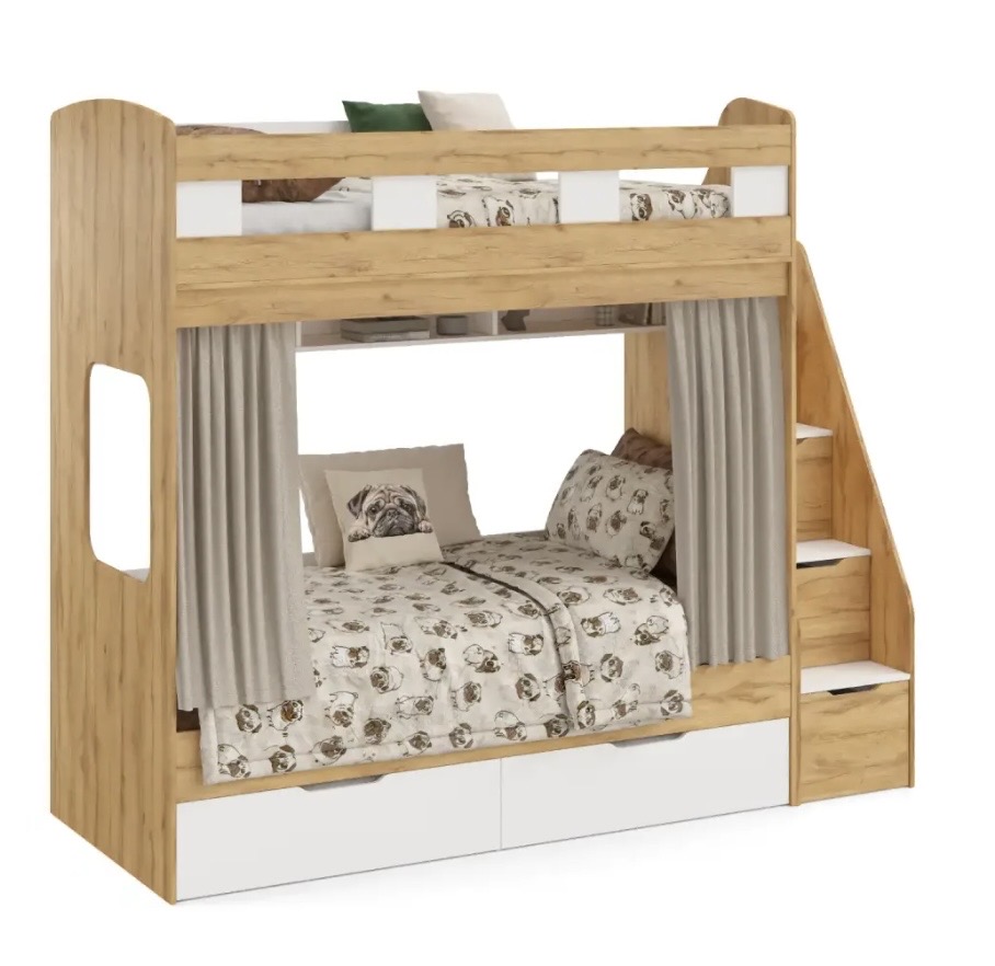 спальное место для двоих, навесная полка для книг и игрушек, вместительные выдвижные ящики под кроватью, а также безопасная лестница расположенная сбоку, обеспечивающая быстрый и удобный доступ на второй этаж, с безопасными ступенями в виде выдвижных ящиков.