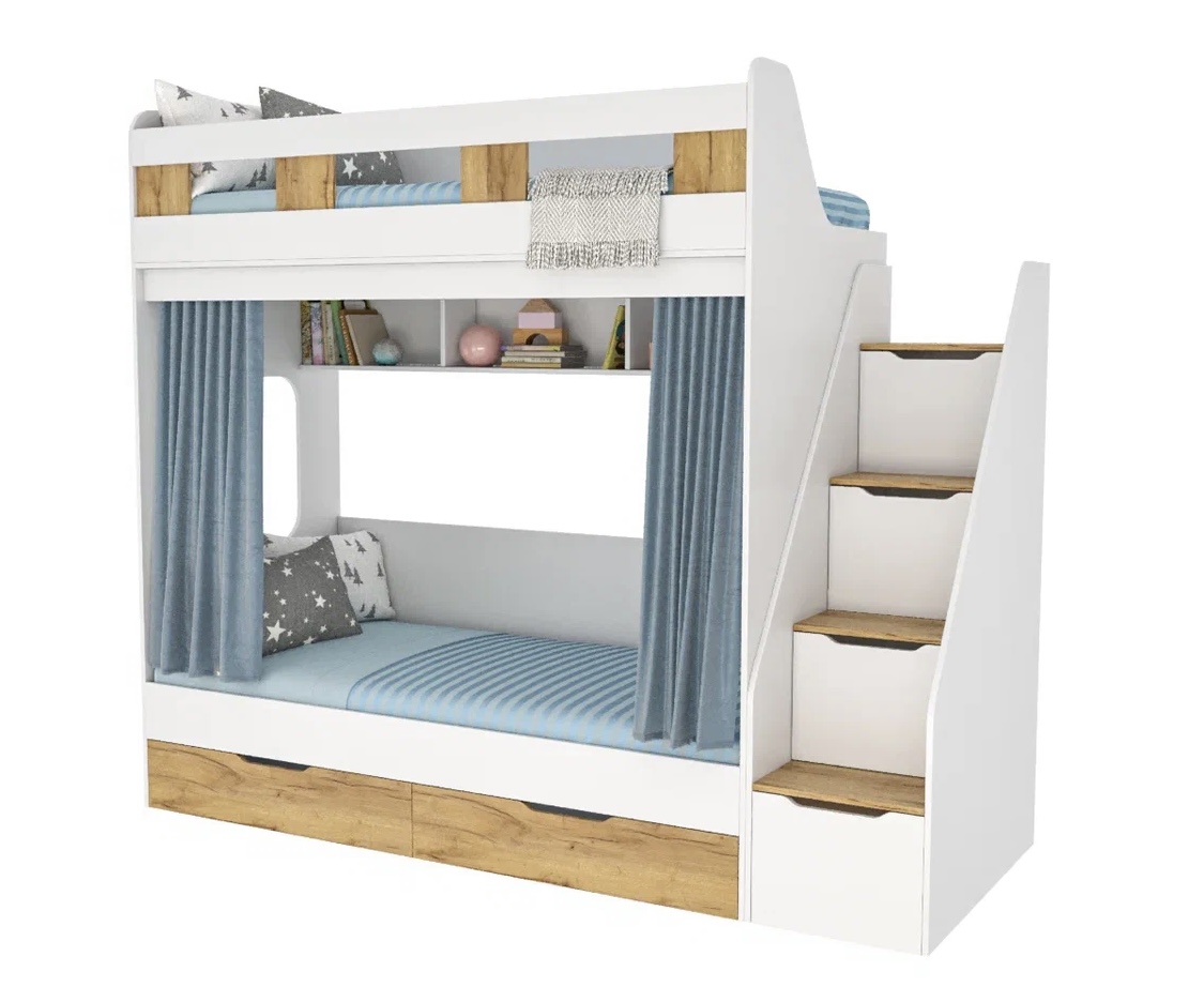 спальное место для двоих, навесная полка для книг и игрушек, вместительные выдвижные ящики под кроватью, а также безопасная лестница расположенная сбоку, обеспечивающая быстрый и удобный доступ на второй этаж, с безопасными ступенями в виде выдвижных ящиков.
