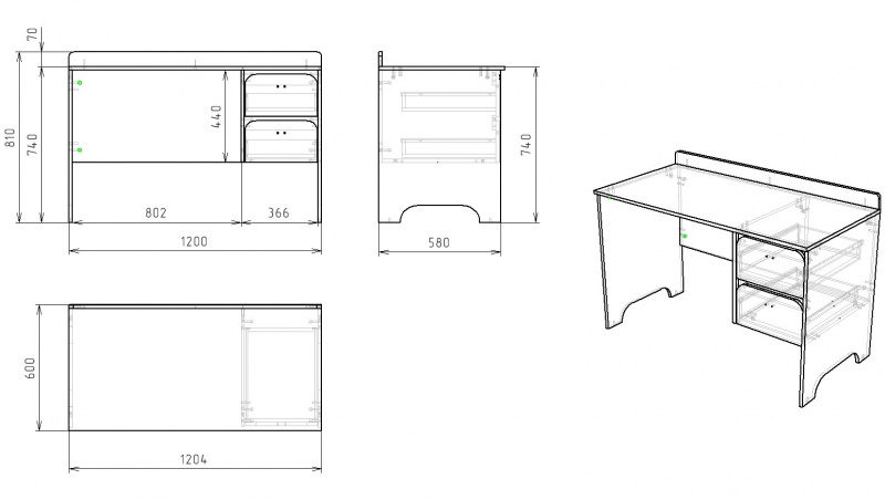 Габариты стола: ширина 1200, глубина 580, высота 740 мм