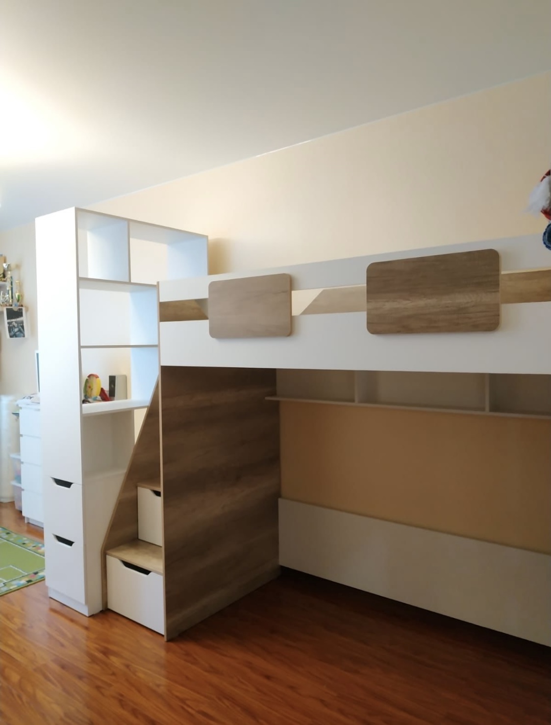 * В лестницу встроены выдвижные ящики для игрушек - удобно и практично.