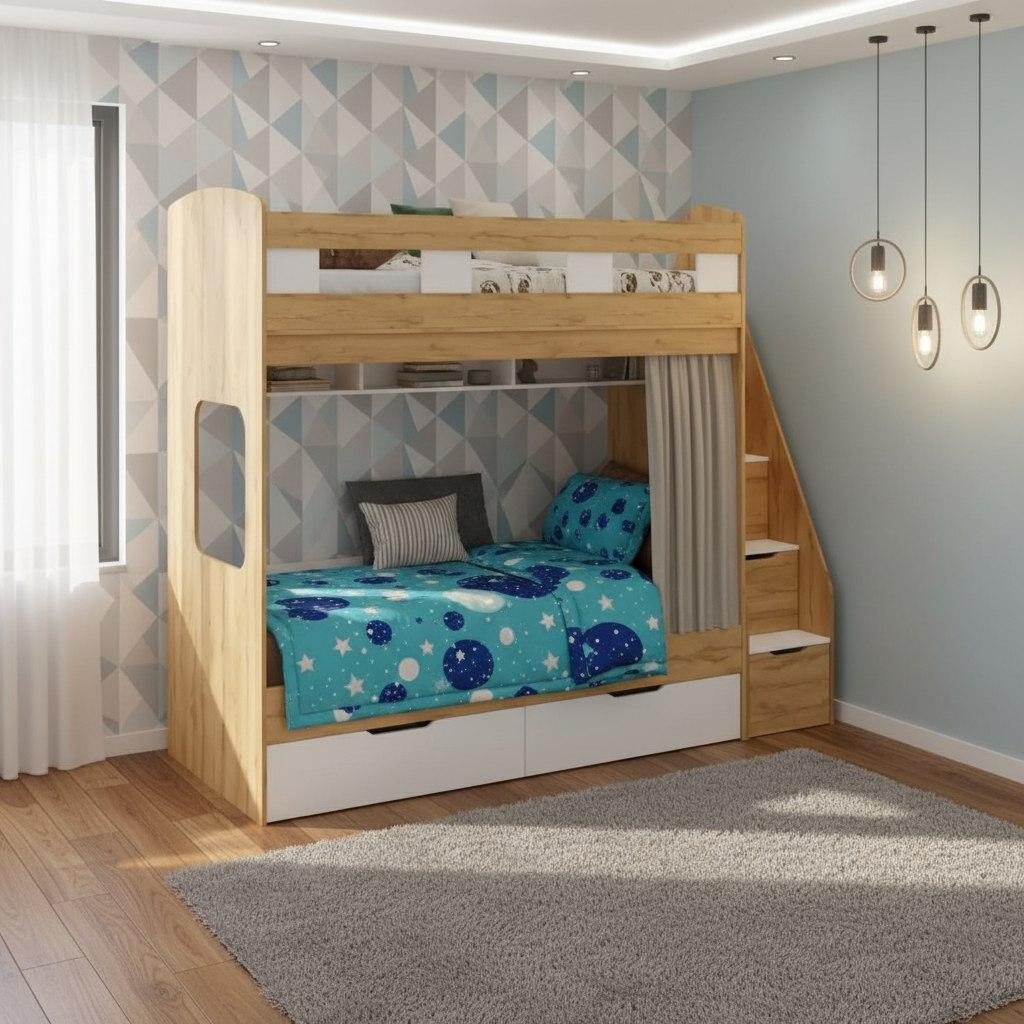 спальное место для двоих, навесная полка для книг и игрушек, вместительные выдвижные ящики под кроватью, а также безопасная лестница расположенная сбоку, обеспечивающая быстрый и удобный доступ на второй этаж, с безопасными ступенями в виде выдвижных ящиков.