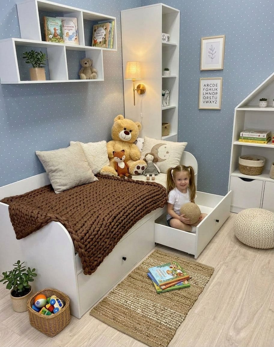 Комплект мебели для детской комнаты: кровать 190х90 + полка Юниор + стеллаж Норд + стеллаж Домик