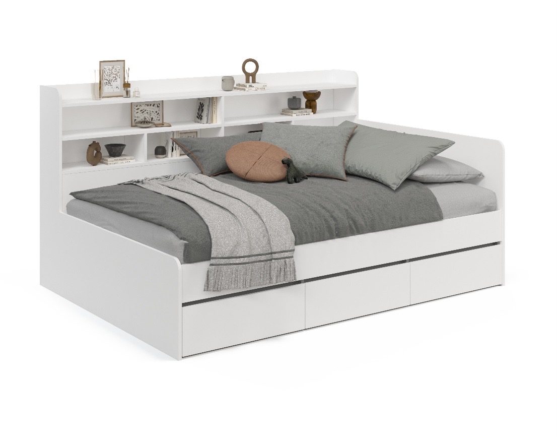 Кровать имеет 3 выдвижных ящика на шариковых направляющих, а также удобные внутренние отделения для хранения вещей.