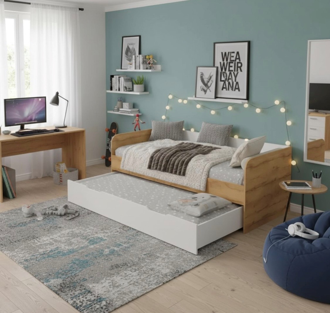 Экономия пространства: выдвижное спальное место легко убирается под основную кровать, освобождая место для игр и активного отдыха.