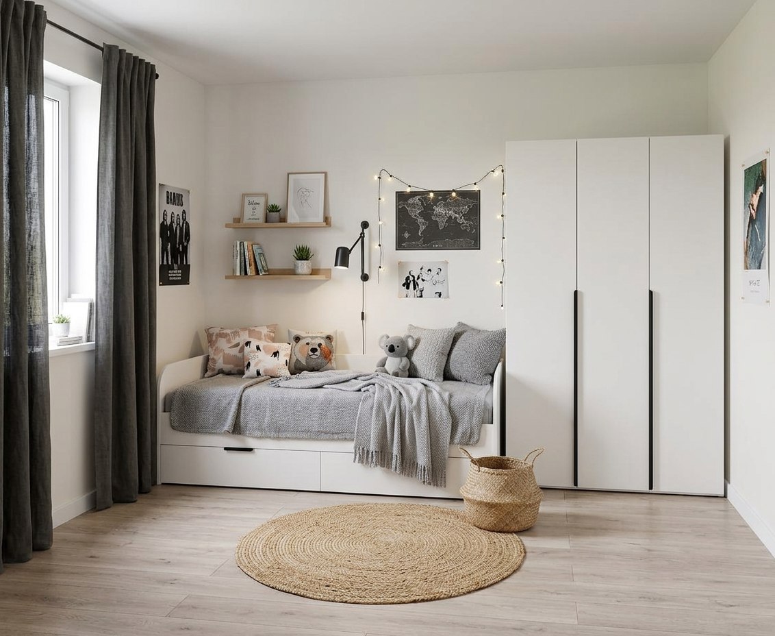 Выдвижные ящики с трендовыми ручками позволяют создать удобное хранение.