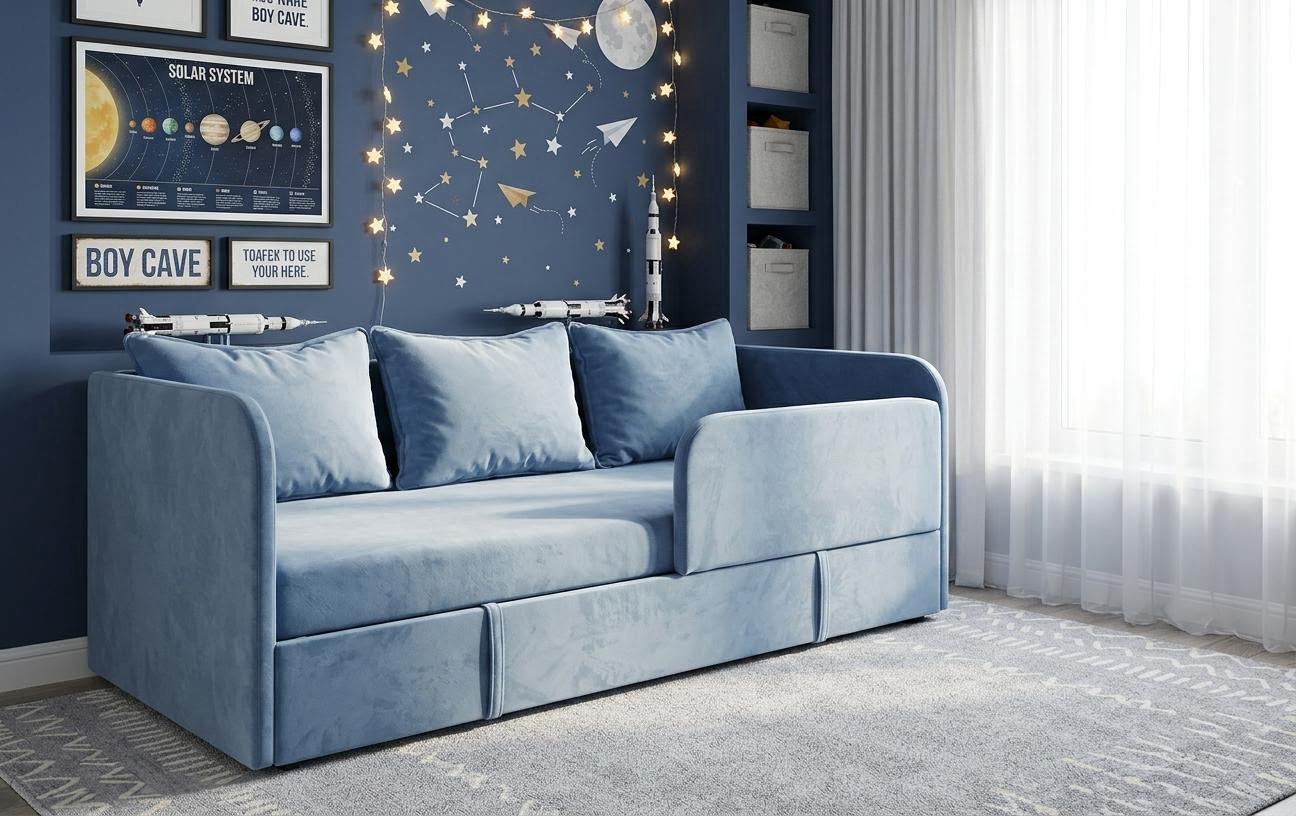 Диванчик подойдет для самых маленьких деток, так как имеет защитный бортик.