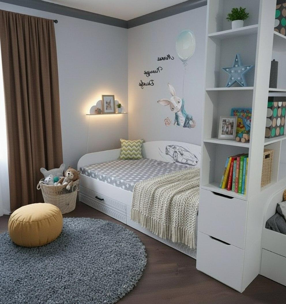 Кровать в современном и стильном дизайне превосходно дополнит интерьер детской комнаты.