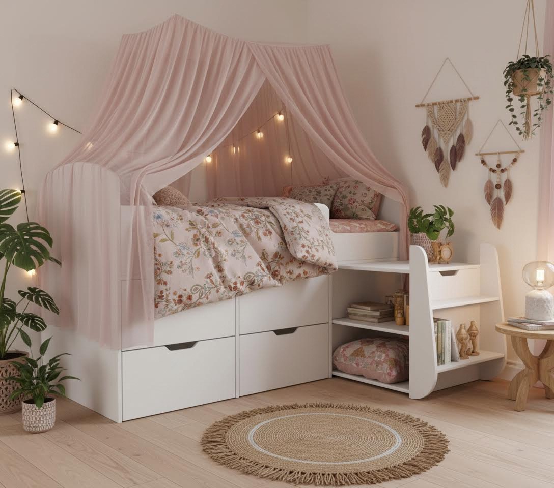Безопасные бортики, удобная выдвижная лестница с внутренними полочками и небольшая высота кровати сделаны специально для детей младшего возраста.