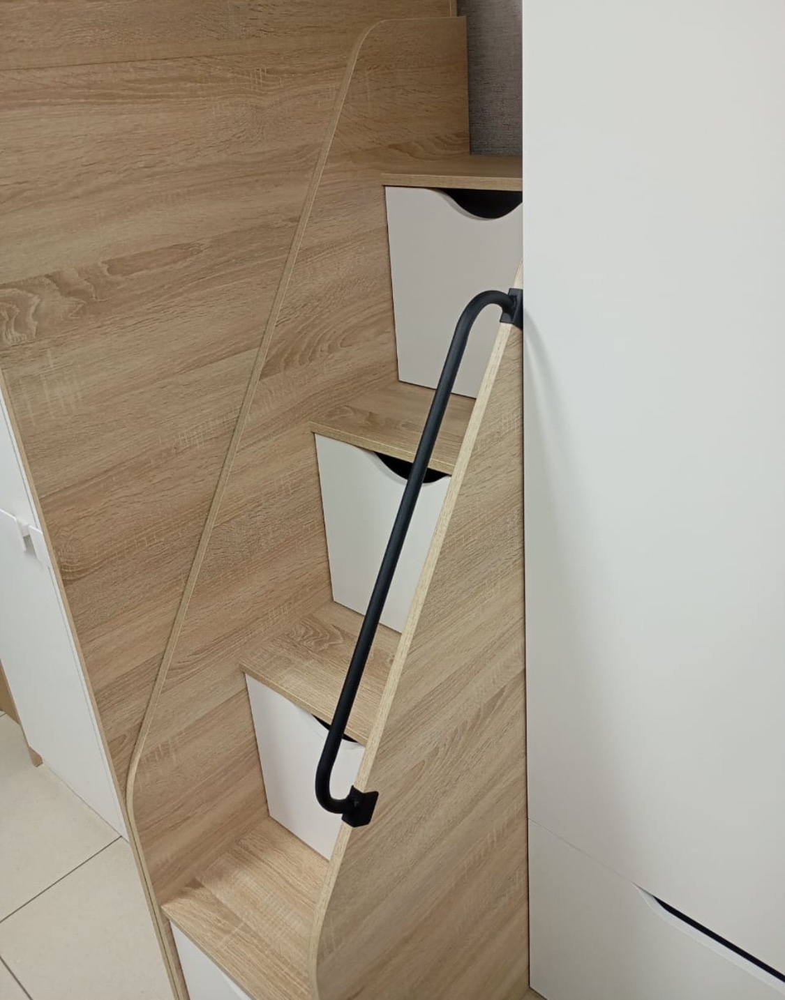 Поручень крепится к лестнице или бортику кровати в вертикальном или горизонтальном положении в зависимости от конструктивных особенностей мебели и удобства пользования.