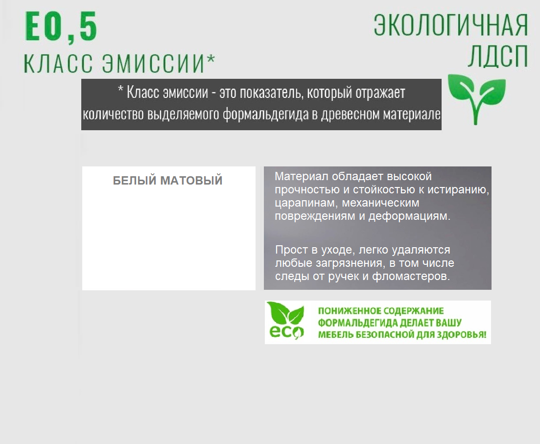 Мебель выполнена из сертифицированного, качественного, экологически чистого ЛДСП класса Е0,5