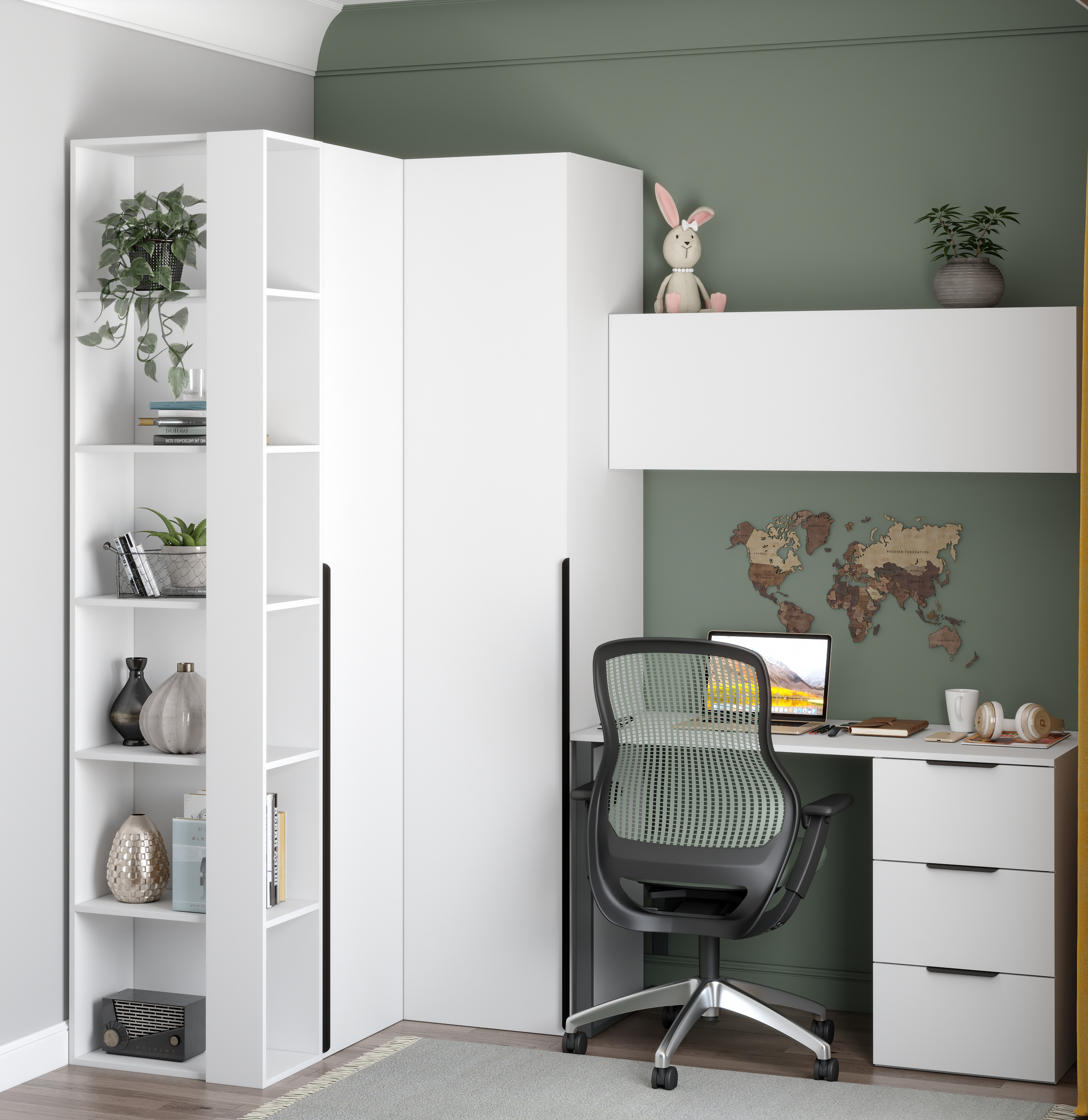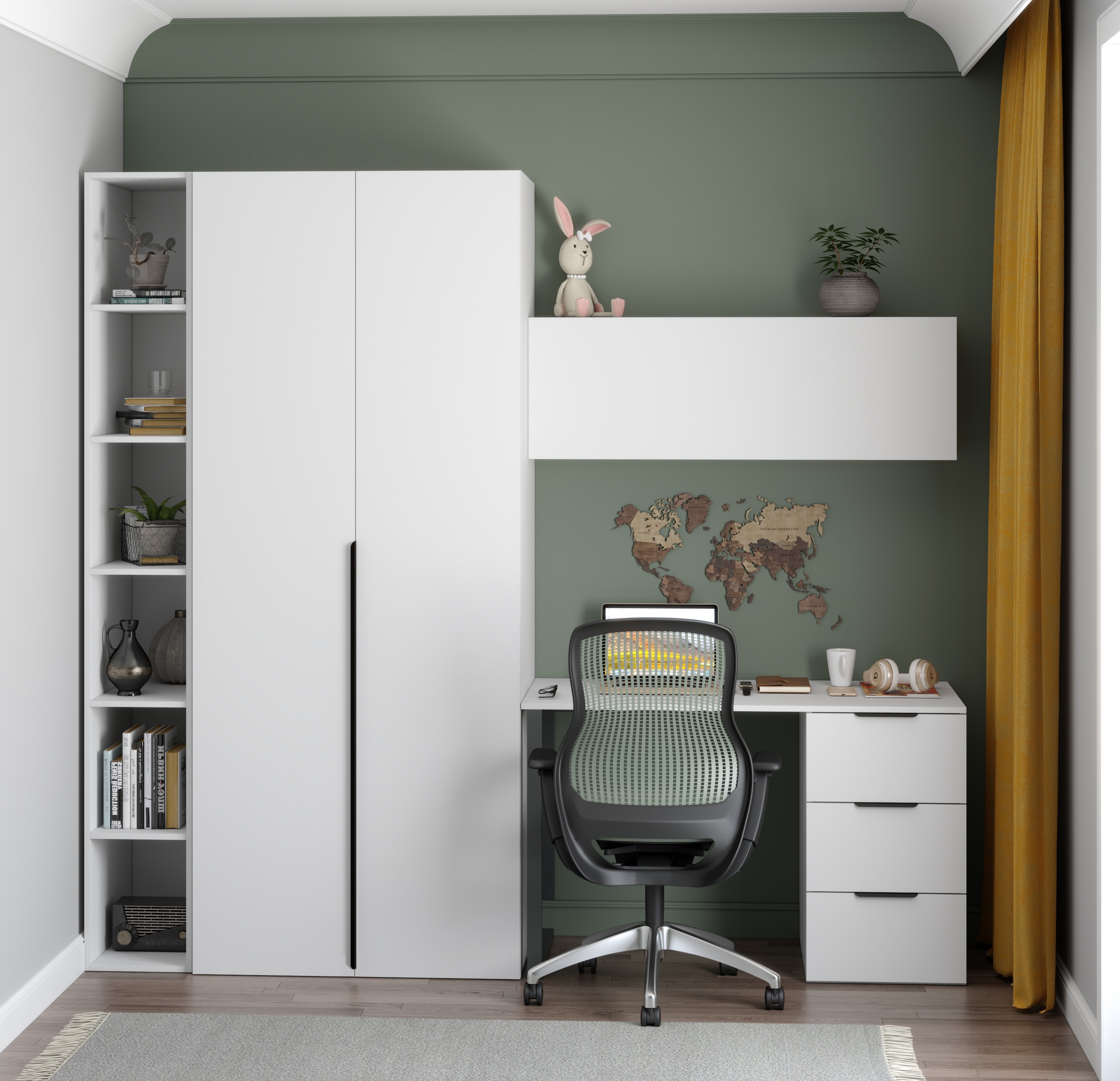 Закрытая полка с дверкой и системой тач-клик идеально подойдет не только для детской комнаты, но и для домашнего кабинета или офиса.