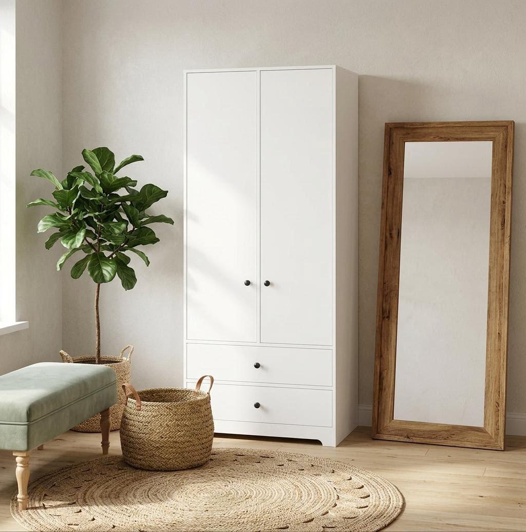 Шкаф поможет максимально грамотно использовать пространство, ведь у него есть два ящика для мелких вещей, штанга, верхние и боковые полки.