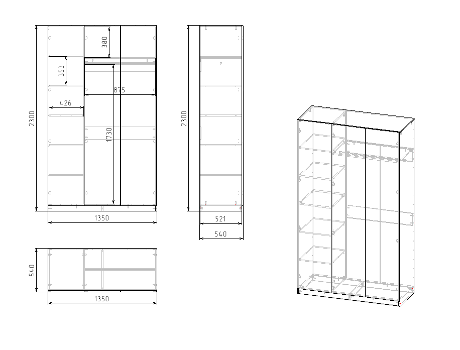 Габариты шкафа: ширина 1350, высота 2300, глубина 540 мм