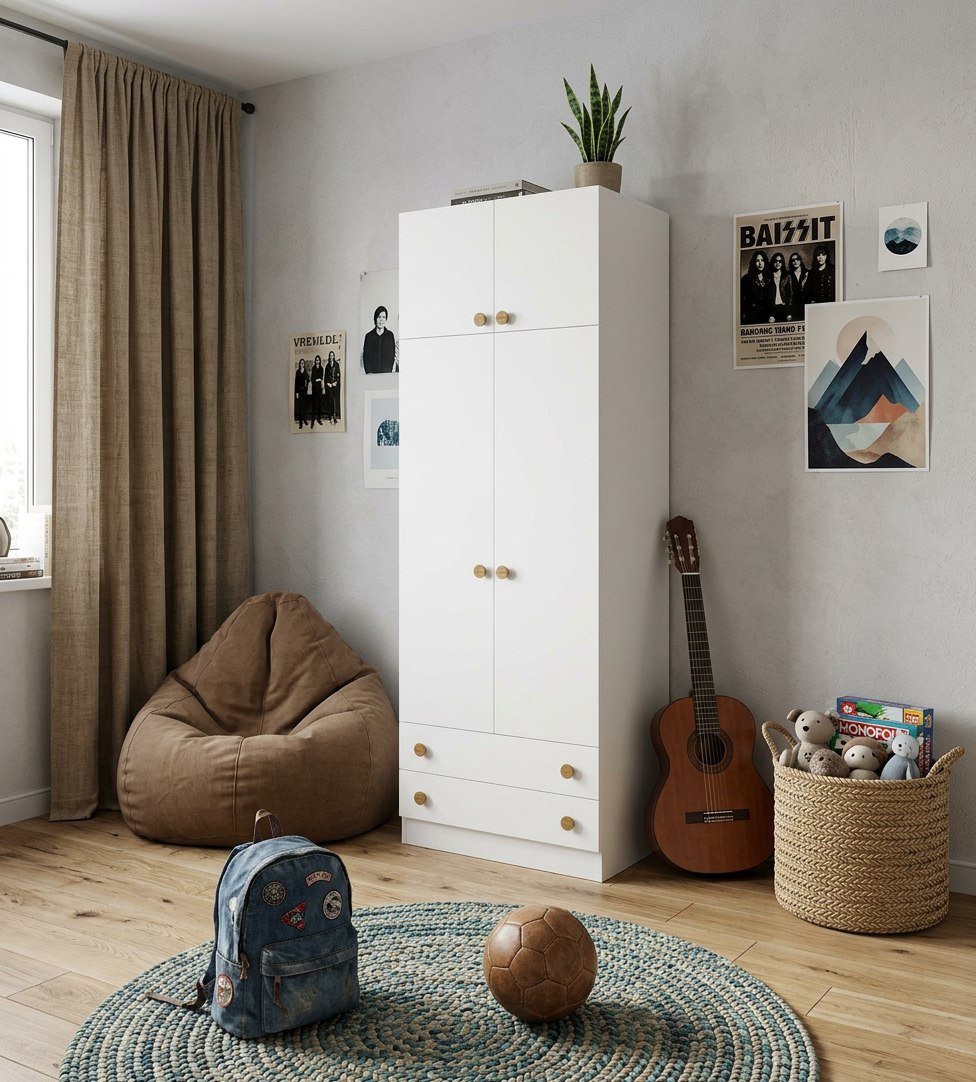 Внутри шкафа имеются штанга для вещей и дополнительные боковые полки.