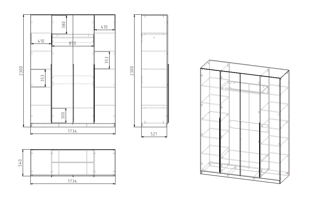 Габариты шкафа: ширина 1734, высота 2300, глубина 540 мм