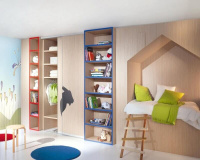 Кровать. Популярен вариант с откидной кроватью. Днем спальное место убирается, а ночью ребенок комфортно спит на просторной кровати. Также есть встроенные модели. Представлены горизонтальным или вертикальным подъемом для сбора. Или в одной конфигурации – кровать примыкает к шкафу.